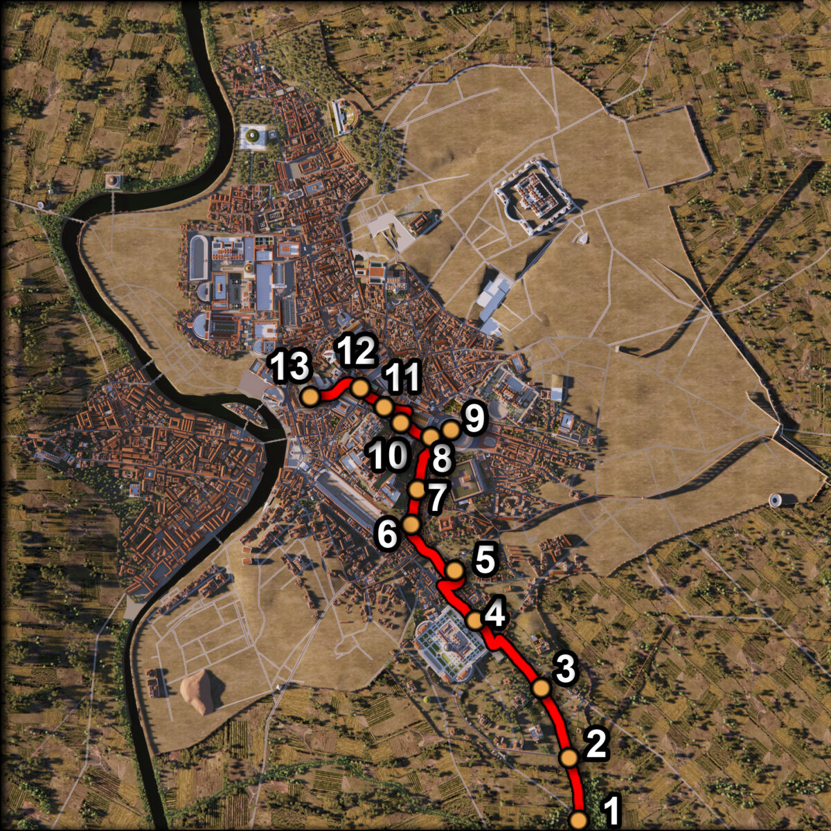 In this video, we’ll see Rome as it was in the 4th century CE and visit many famous locations, such as the Porta Appia (2), the Tomb of the Scipios (3), the Baths of Caracalla (4), the Mutatorium (5), the Septizodium (6), the Aqua Claudia (7), the Meta Sudans (8), the Colosseum (9), the Arch of Titus (10), the Via Sacra (11), the Forum Romanum (12), and finally, the Capitoline Hill itself with the Temple of Jupiter (13). Enjoy!